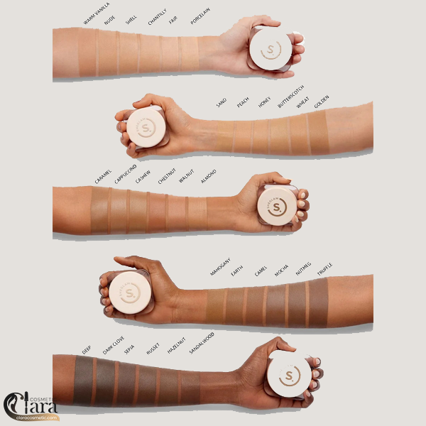 بالم کرم پودری شیگلم رنگ fair، Warm Vanilla، Peach، Almond، Walnut، Chestnut، Earth، Sandal Wood، Hazalnut و Deep.