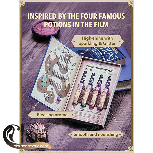 این پک همچنین شامل چهار عدد لیپ گلاس با درخشندگی بالا است که رنگ ها و فرمولاسیونشان از نوشیدنی های جادویی الهام گرفته شده اند. این لیپ گلاس ها نه تنها لب ها را مرطوب و نرم نگه می دارند، بلکه با درخشندگی خاص خود، آرایش شما را به یک ظاهر جادویی و خاص تبدیل می کنند.