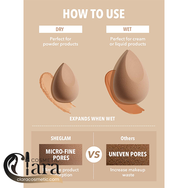 - استفاده: مقداری از محصولات آرایشی را روی اسفنج بزنید و با حرکات ضربه ای و ملایم، آن را به طور یکنواخت روی پوست پخش کنید.